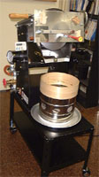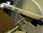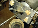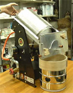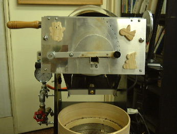 この部分は、一番苦労した部分です。焙煎機の内部の温度をはかる 温度計とコーヒー豆のサンブルを取り出すスプーンをこれひとつで兼用しています。 焙煎機の内部は、コーヒー豆をかくはんする羽根がついており、 その羽根にひっかからないためには中心の部分しかつかえません。 そのため、まっすぐにスプーンを差し込めるようにガイドがついています。 そのガイドに沿わせてすべらせれば、スプーンで安全確実に豆を取り出すことが できます。