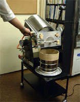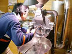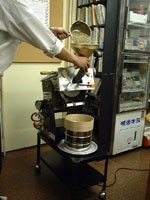 ひかりのさとでは、富士ローヤル5kg釜が、現在では稼動中です。 焙煎室は、きれいで結構広くて非常に快適な環境です。 ハンドピックできるテーブルも広く取ってあり、なにもかもがゆったりと しています。このぐらいのスペースがあれば、月に1tぐらいのコーヒーが 生産できるように思います。あとは、生協など販路を開拓すればばっちり だと思いました。 中島さんに「煎っ太郎を引き取りましょうか」と聞いたら 「あれは、初めてコーヒーを焙煎する人に、コーヒーの焙煎されていく様子や 香りや煙などが手にとるようにわかって練習用の機械としてはまだまだ、 使いますからだめです。」とやんわり断られてしまいました。 実は、あの機械を欲しがっている人がけっこういっぱいいて何とかして欲しいと 頼まれるんです。どーーしても、業務用の焙煎機では、釜の中でコーヒー豆が どんな状態になっているかが肌で感じる事が出来ないんです。 それに対して煎っ太郎は、すべてが実感できるんです。欠点としては、一回の焙煎量が 少ない事だけなんです。 (写真・広い作業場で焙煎中の中島さん)