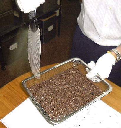 | 仕上げ | 色見本の豆とあわせて豆をざるにうつします。 その時、豆がのびているか、黒いしわが残っていないかも 確かめるポイントのひとつです。 |