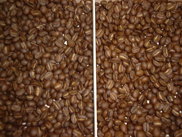 | 左側 ミルク缶焙煎機で煎った豆 13分で焙煎終了。 終了時間がちょっと早い。反省。 | 右側 フジローヤルR-103直火式焙煎機 にて焙煎。 |