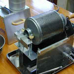 つぎに、ドラムをはずして熱いコーヒー豆をざるに移します。