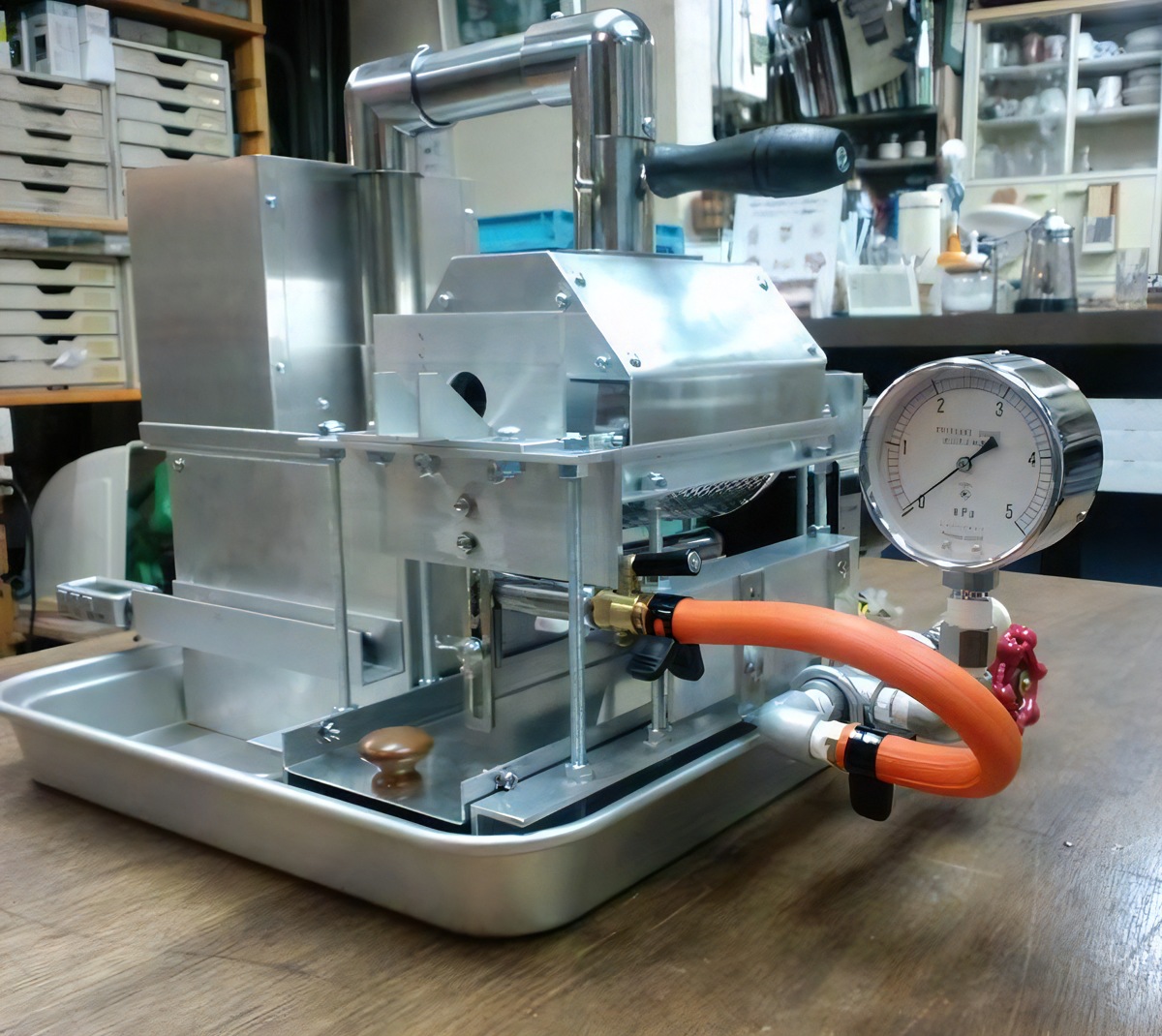 つまり、大型の焙煎機のサイクロンの代わりにこの水に煙をぶつけてチャフを止めるというわけです。