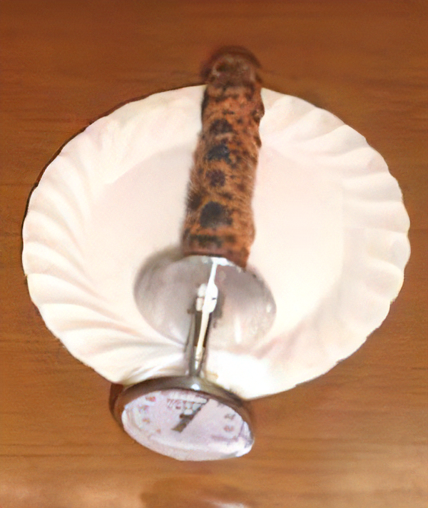 この温度計にソーセージを差し込んで焙煎機の蒸気発生装置を使った状態と 使わない状態ではどれくらいソーセージか乾燥するかなどを調べてみました。