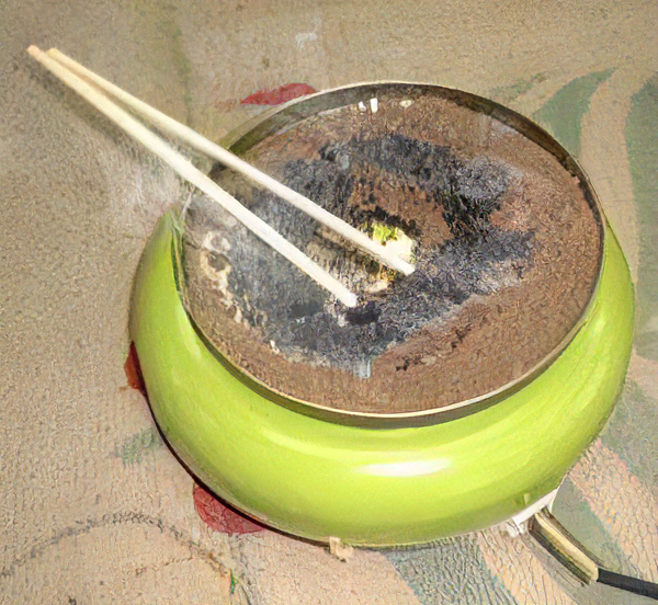 クリンカーを皿に入れて電熱器で熱を加えます。 煙が出てクリンカーが液化します。