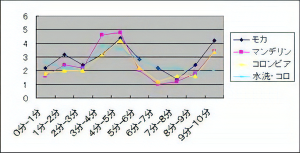 どのコーヒーも、最初の5分間は水が抜けていないようにみえます。