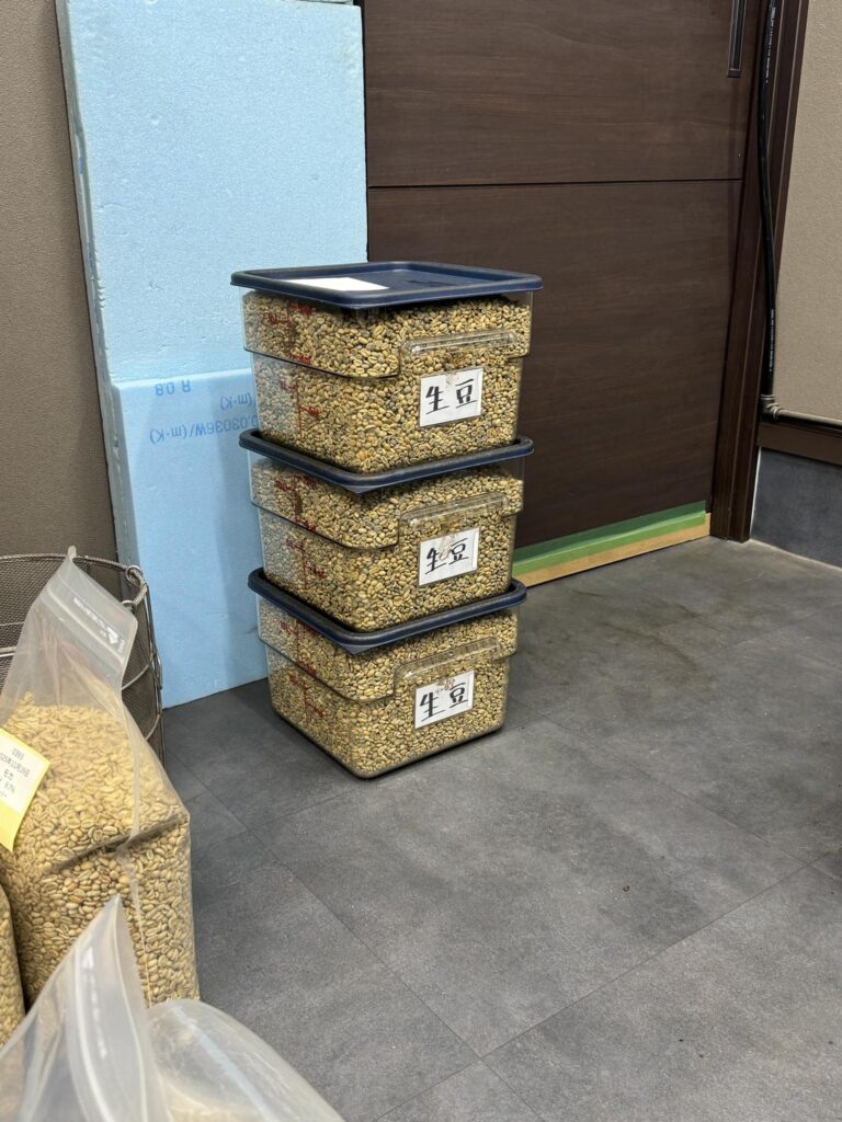 きっちりと生豆をブレンドし水分を馴染ませるために数日間寝かせておきます