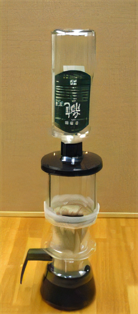 普通コーヒー酒をつくる場合、お酒にコーヒー豆をつけてつくります。 (たぶんこれが一般的) だけど、普通にコーヒーをつくるときこの方法をとる人は、 ほとんどいないはずです。やっぱり、おいしいコーヒーを飲みたければ ドリップ式を選ぶはずです。ドリップ式の方がコーヒーのうまみだけを 溶かし込むことができてやっぱりコーヒーがうまいのです。 となれば、コーヒー酒をつくる場合でもドリップ式を採用すれば もっとおいしいコーヒー酒ができるんじゃあないかと考えました。