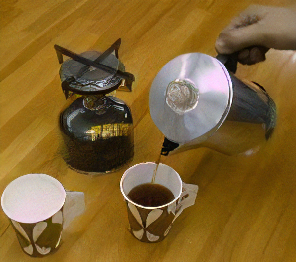 5人用パーコレーターって大きいサイズのカップラーメン2ヶ分の お湯が沸かせるんですよ。 それを食べている間にコーヒーを作るわけです。 そうすると食べている途中でコーヒーのいい香りがしてくるんですよ。 カップラーメンだけだとさみしい食事もコーヒーがあるだけでなんだかリッチな感じになるんです。 それにパーコレーターは熱いコーヒーが飲めて、体があったまっていいんです。
