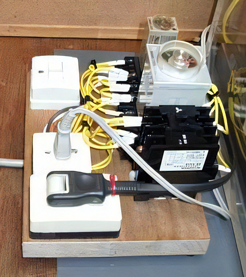アクリル板でできた箱の中にコーヒーメーカーが入っており外側の回路で制御できるようになっています