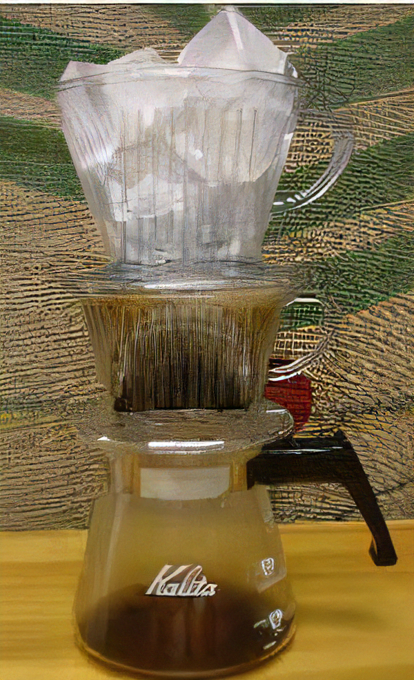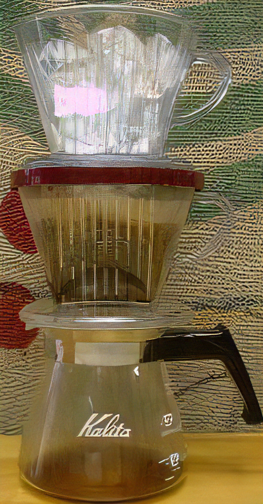 氷だしコーヒーをつくろうで使った器具です。102-Dドリッパー(上部の氷をいれる部分) を改良して性能がぐっとアップしました。(基本形)