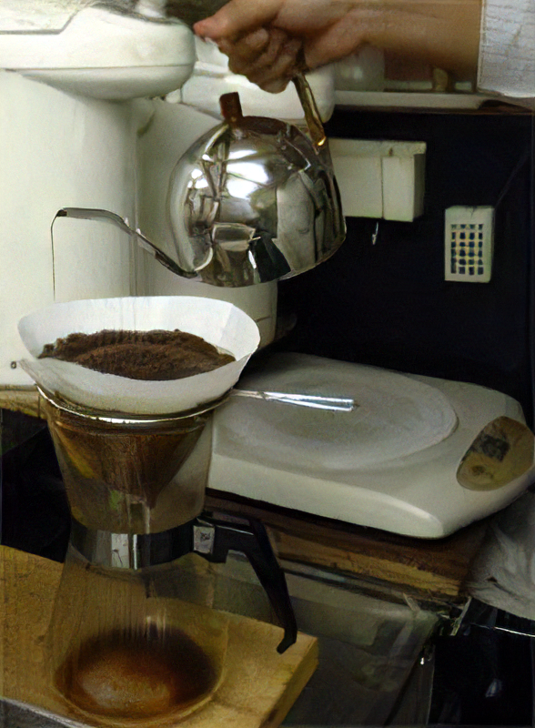 コーヒーの粉は、150g使います。ひき方は、あらびきです。 ドリップポットに1000ccのお湯を用意します。 全体にお湯をかけたら、3分間の蒸らしをします。(松屋式ドリップを参考にしてください)