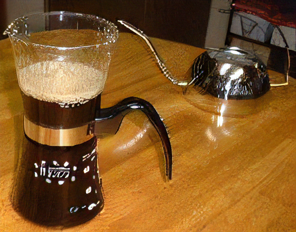抽出した濃いコーヒー液・・・・・ (しっかり蒸らしてていねいにコーヒーを抽出すると人数分の半分ぐらいまでにコーヒーのうまみをすべて抽出することができる)