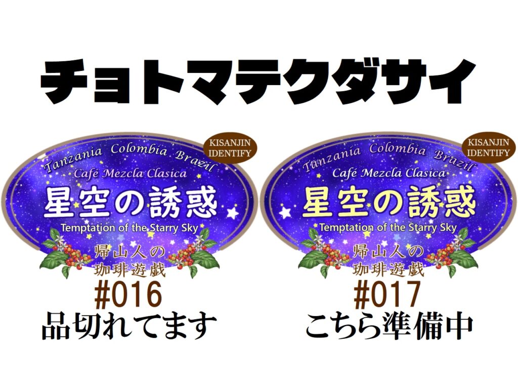 ただいま定番ブレンド「星空の誘惑」は品切れています。#016は完売しました。次の