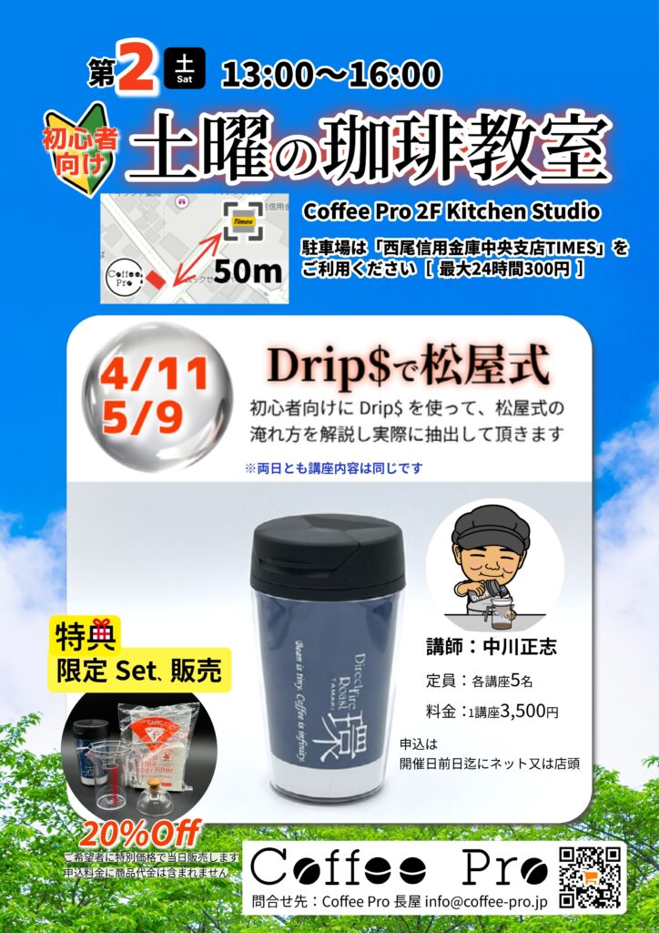 こんにちは。 4月、5月の「土曜の珈琲教室」について、申込を開始致しました。 珈
